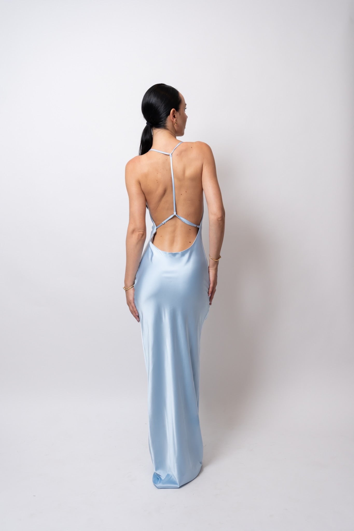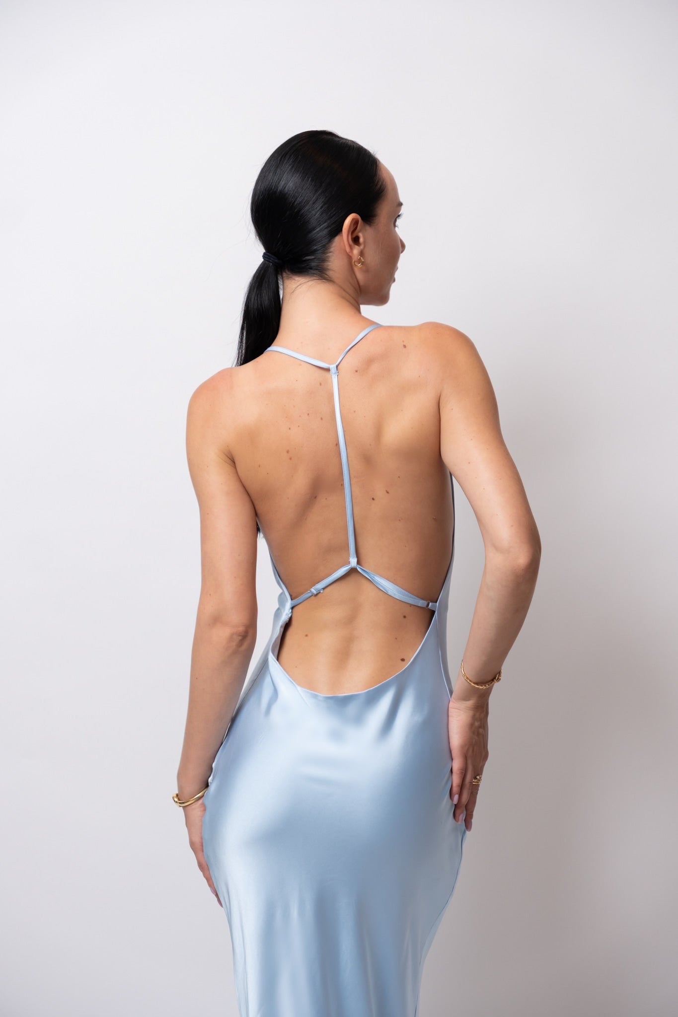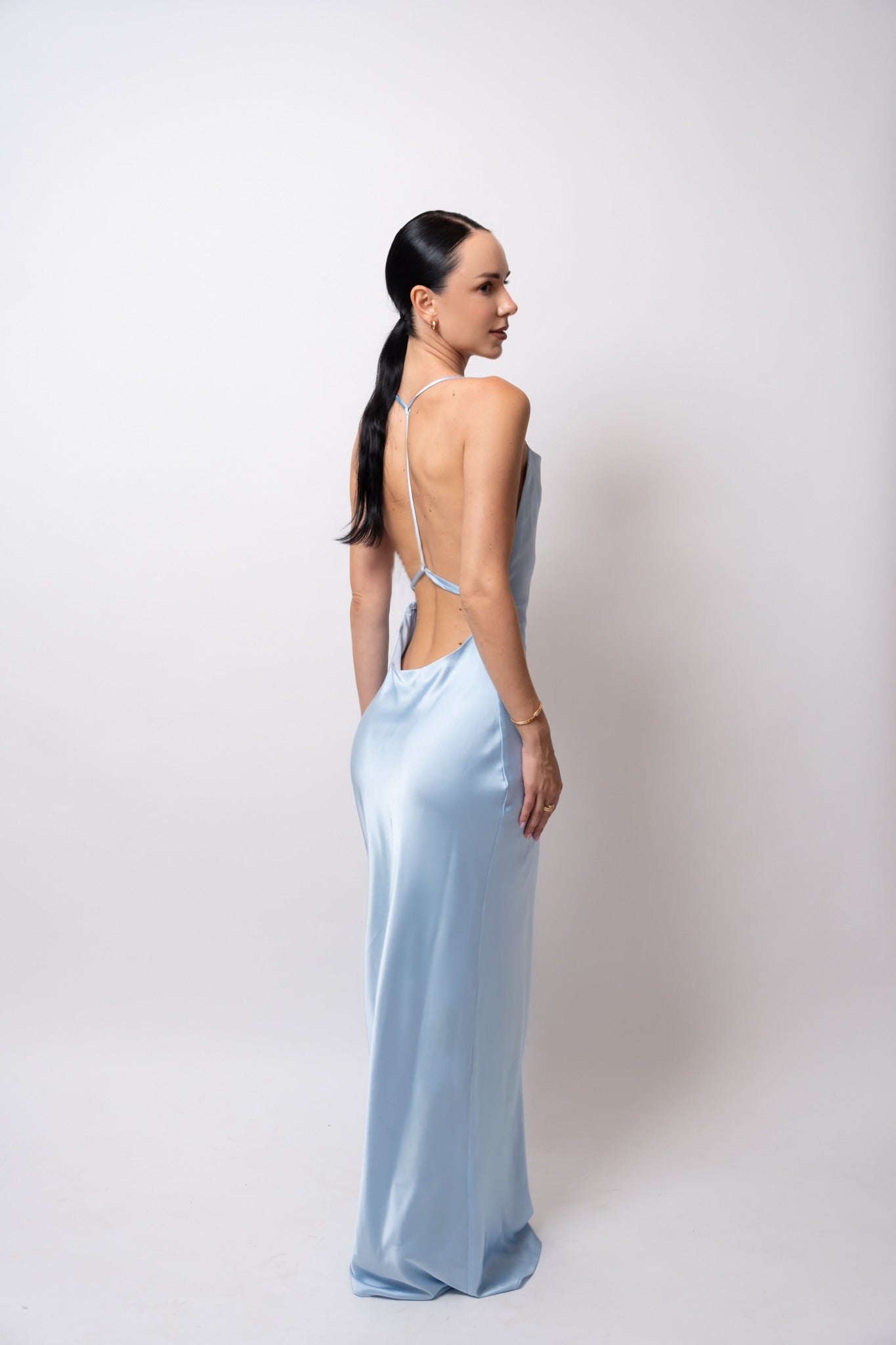 Su espalda descubierta añade un toque de sensualidad y así mismo, el bolero que puede colocarse de distintas maneras o retirarse por completo, permitiendo transformar el look según la ocasión.