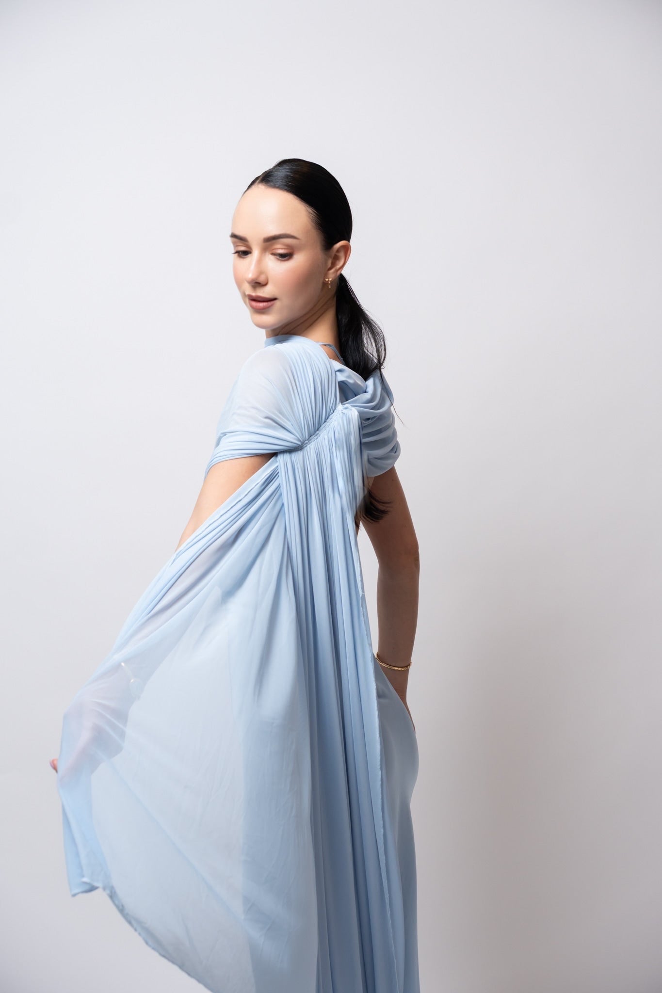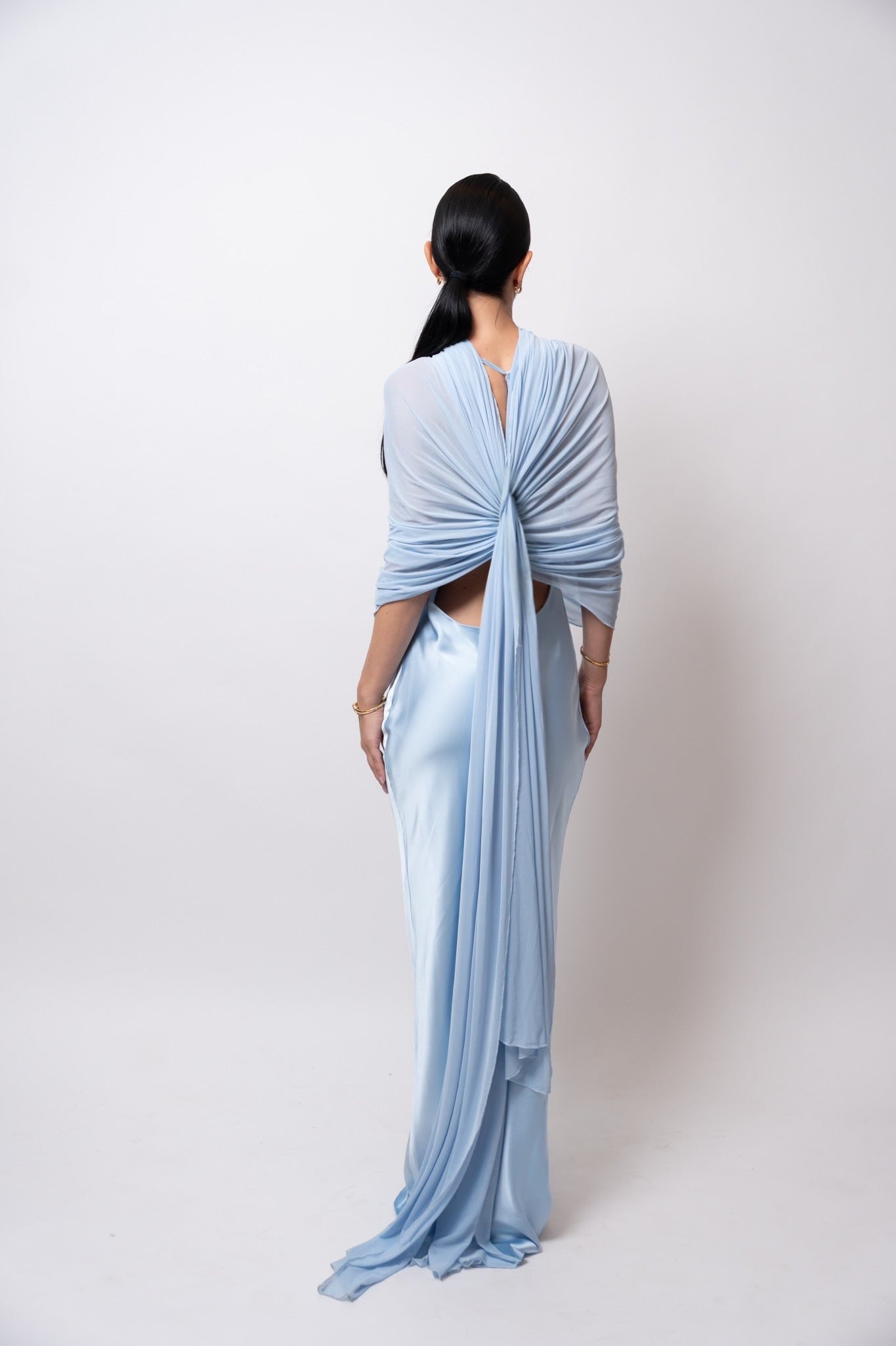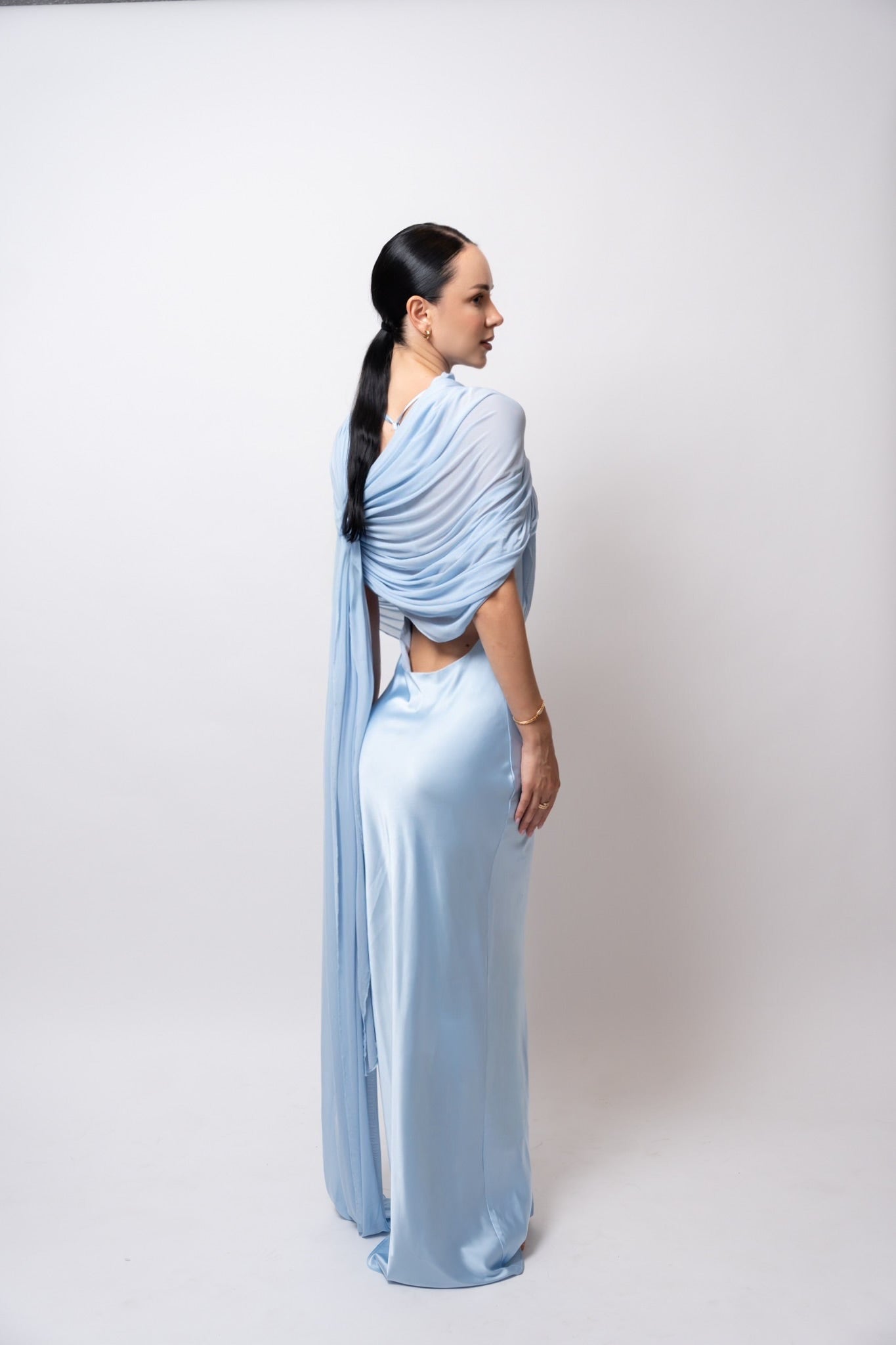 El tejido cae con suavidad gracias al drapeado fluido, aportando movimiento y elegancia al caminar. Este vestido se adapta perfectamente al cuerpo, brindando comodidad sin sacrificar estilo.