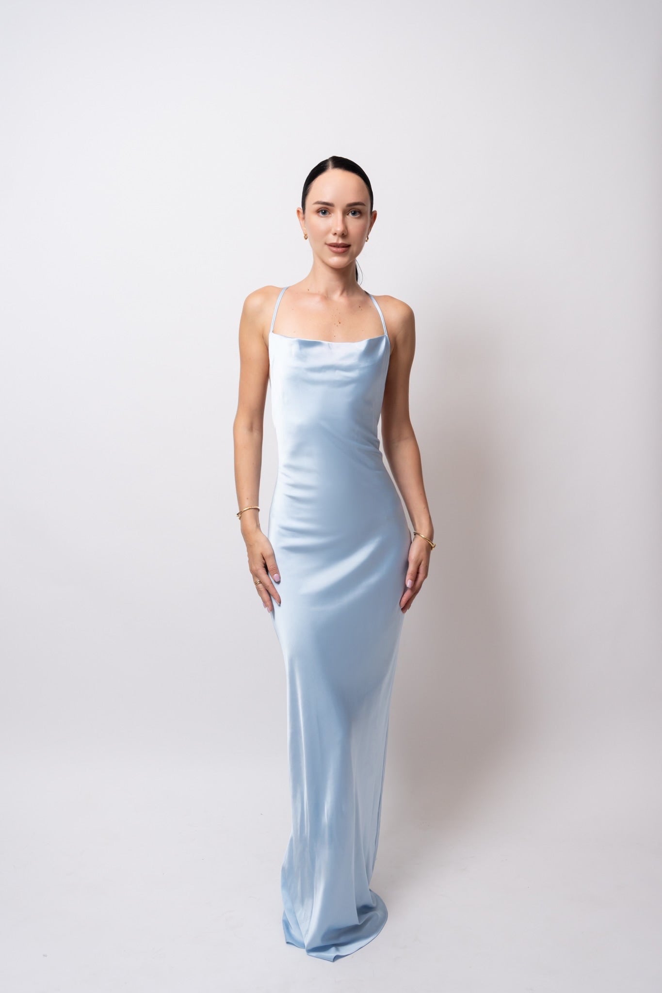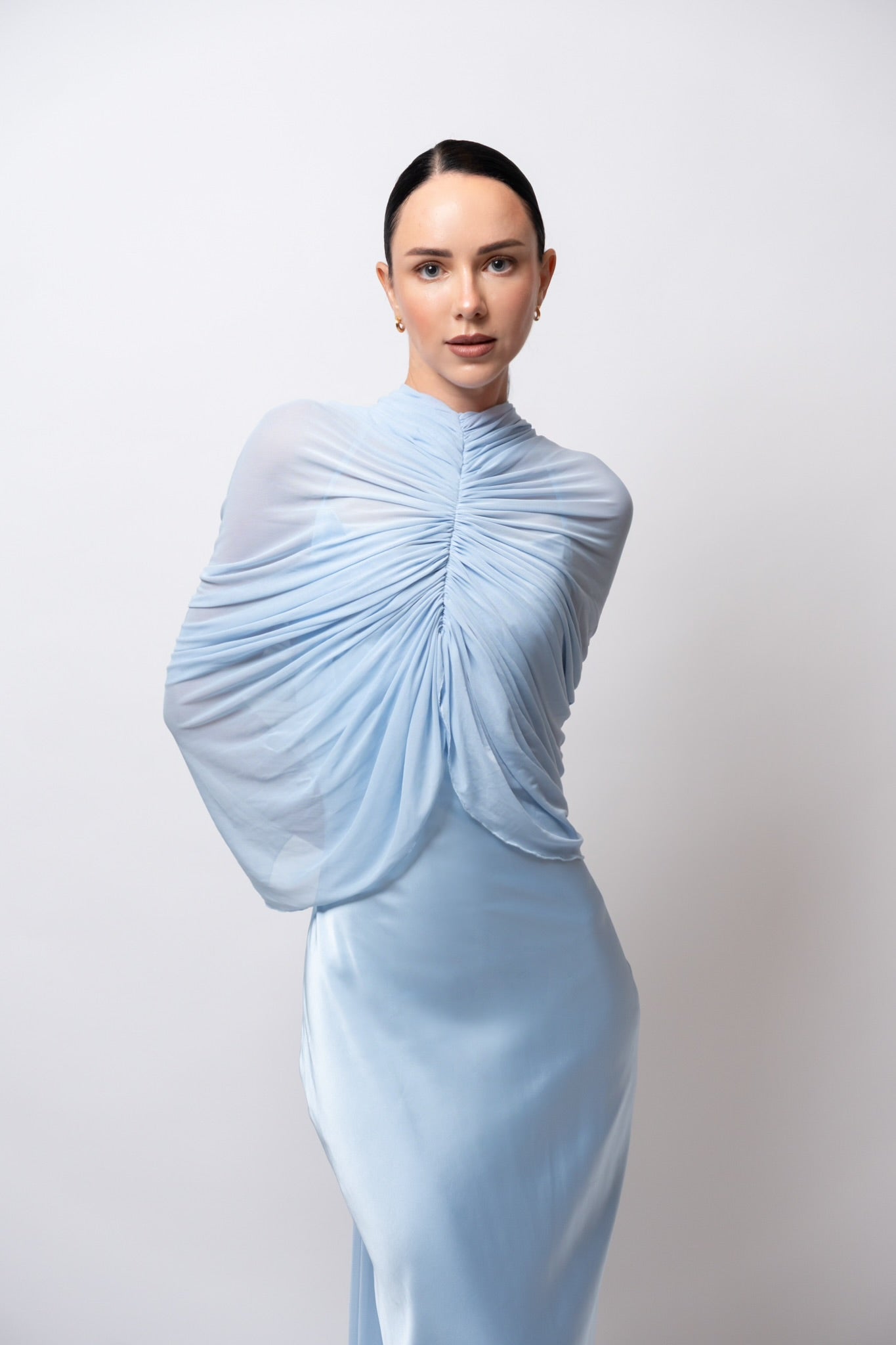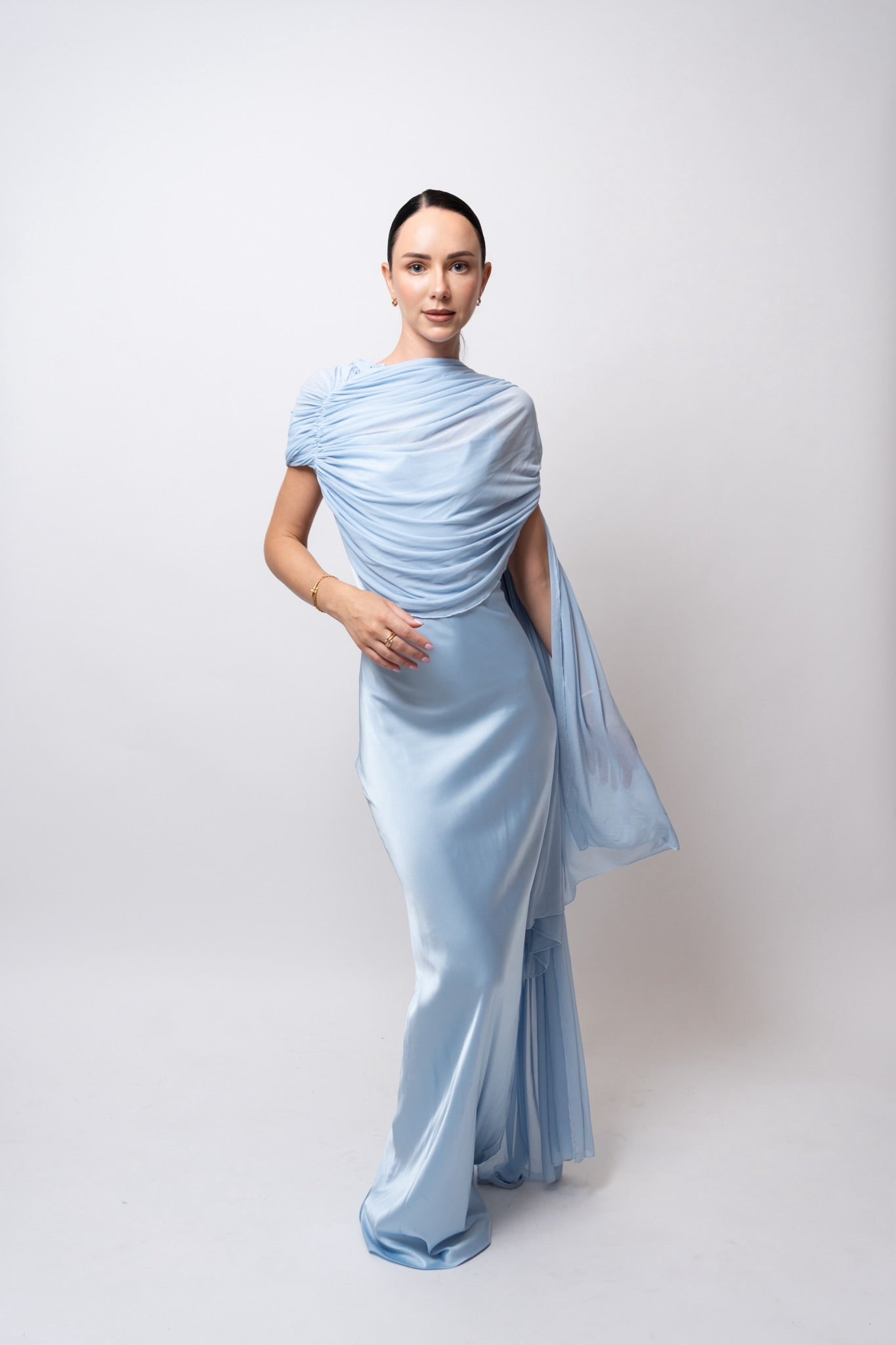 El tejido cae con suavidad gracias al drapeado fluido, aportando movimiento y elegancia al caminar. Este vestido se adapta perfectamente al cuerpo, brindando comodidad sin sacrificar estilo.