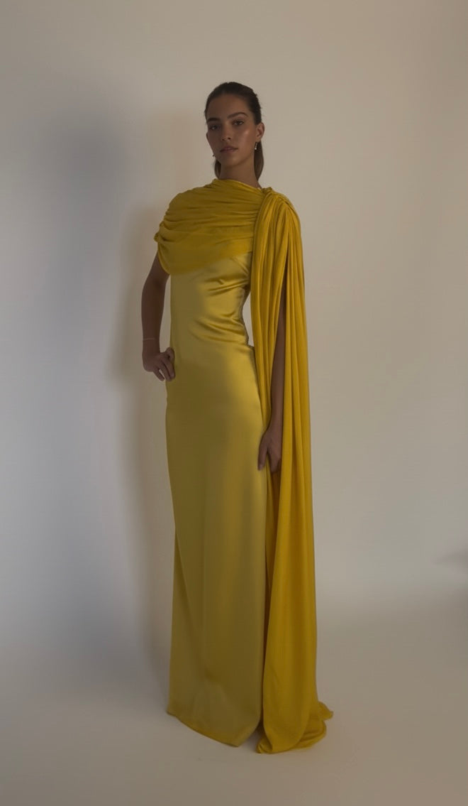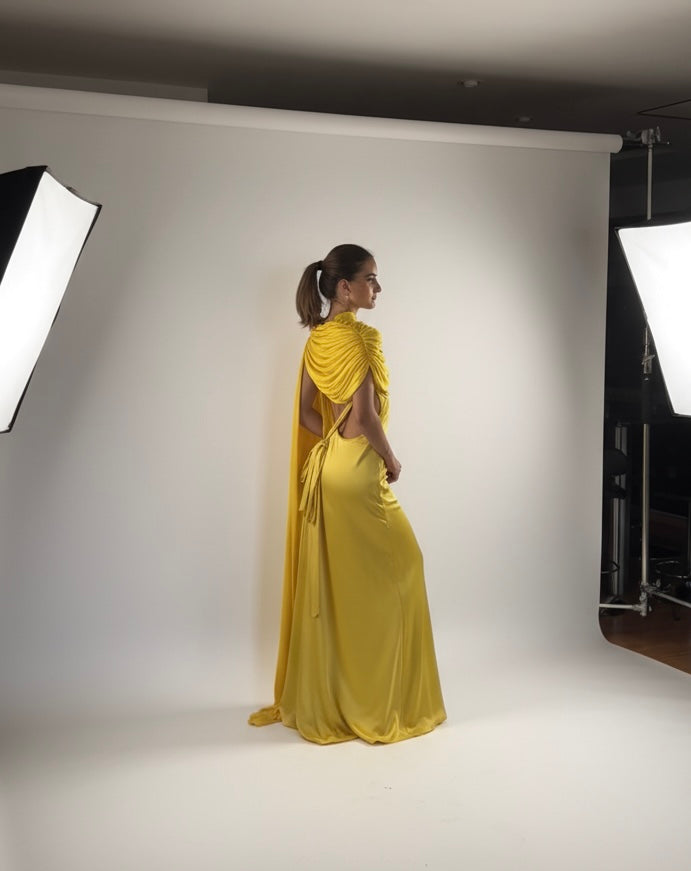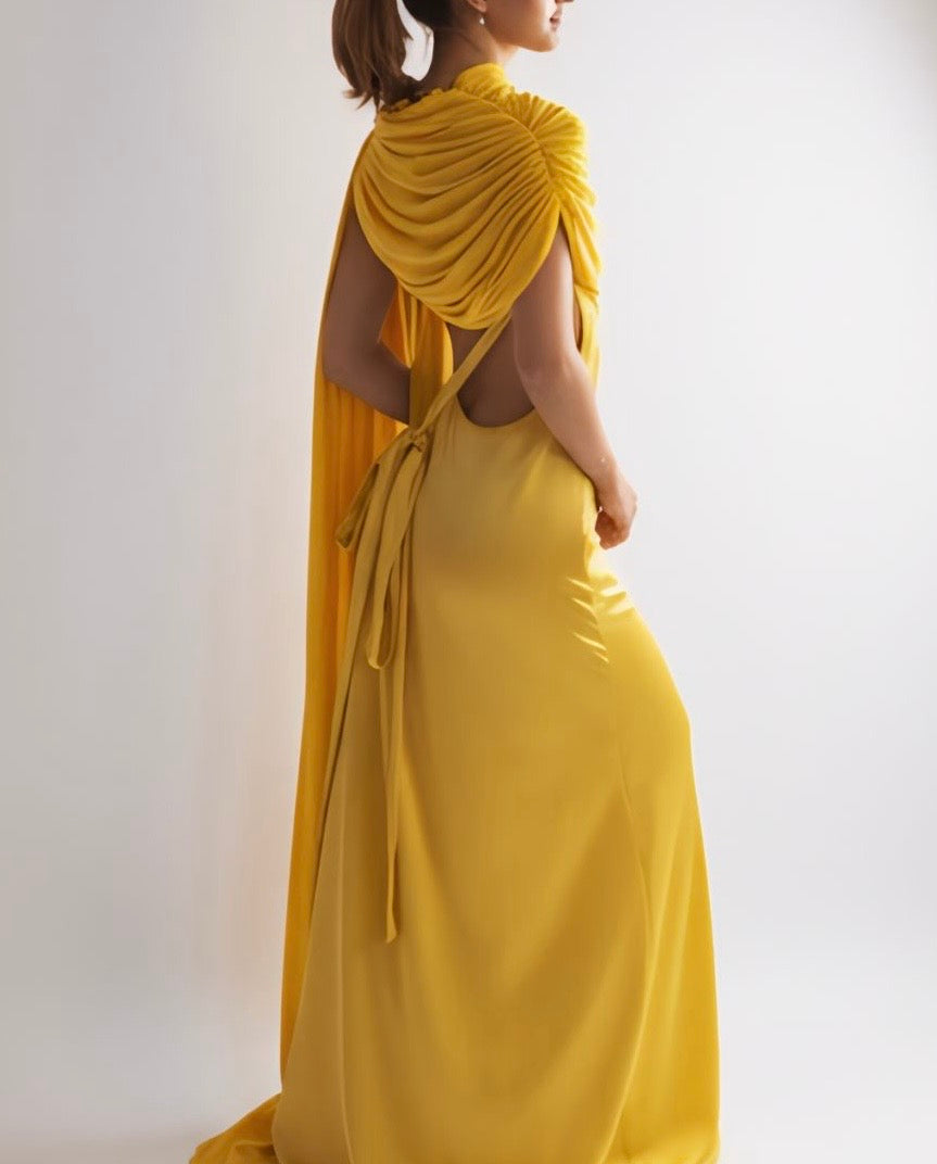 El drapeado en la parte superior conecta la capa con el cuerpo del vestido, haciendo que el conjunto se vea armonioso, imponente y perfectamente equilibrado.