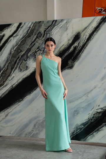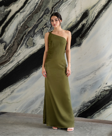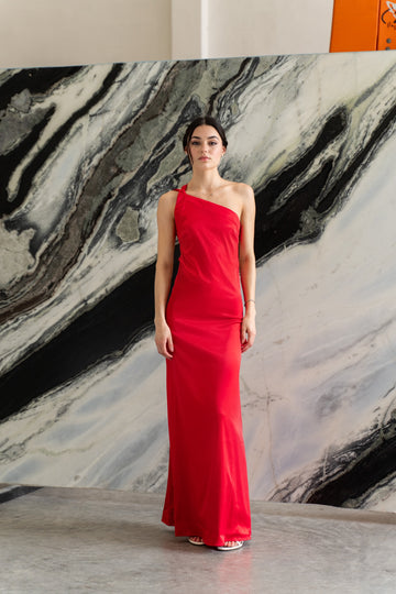 Vestido sofisticado de tela suave con corte asimétrico (un hombro) moderno, ajustable, hecho para acentuar la elegancia en ti, combinando un estilo innovador con su espalda totalmente descubierta.