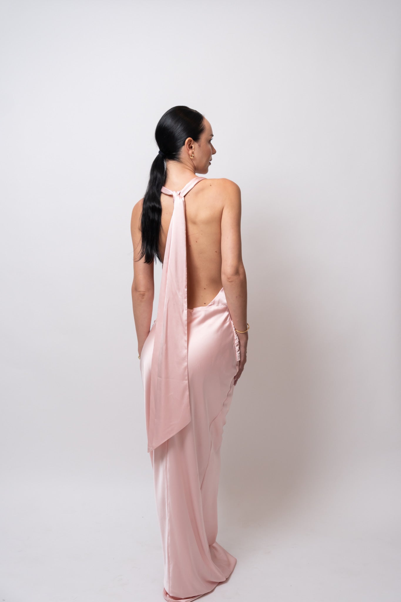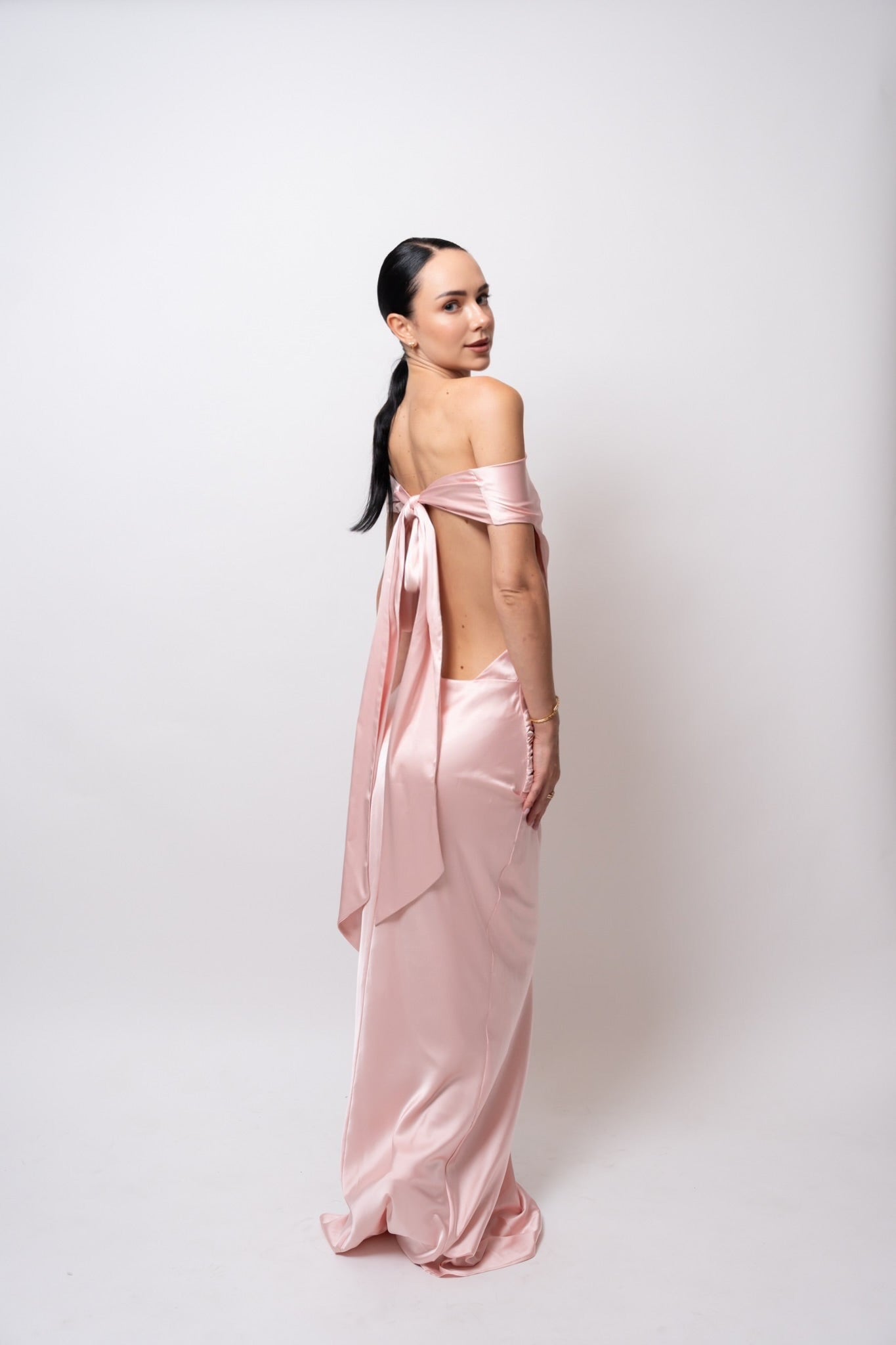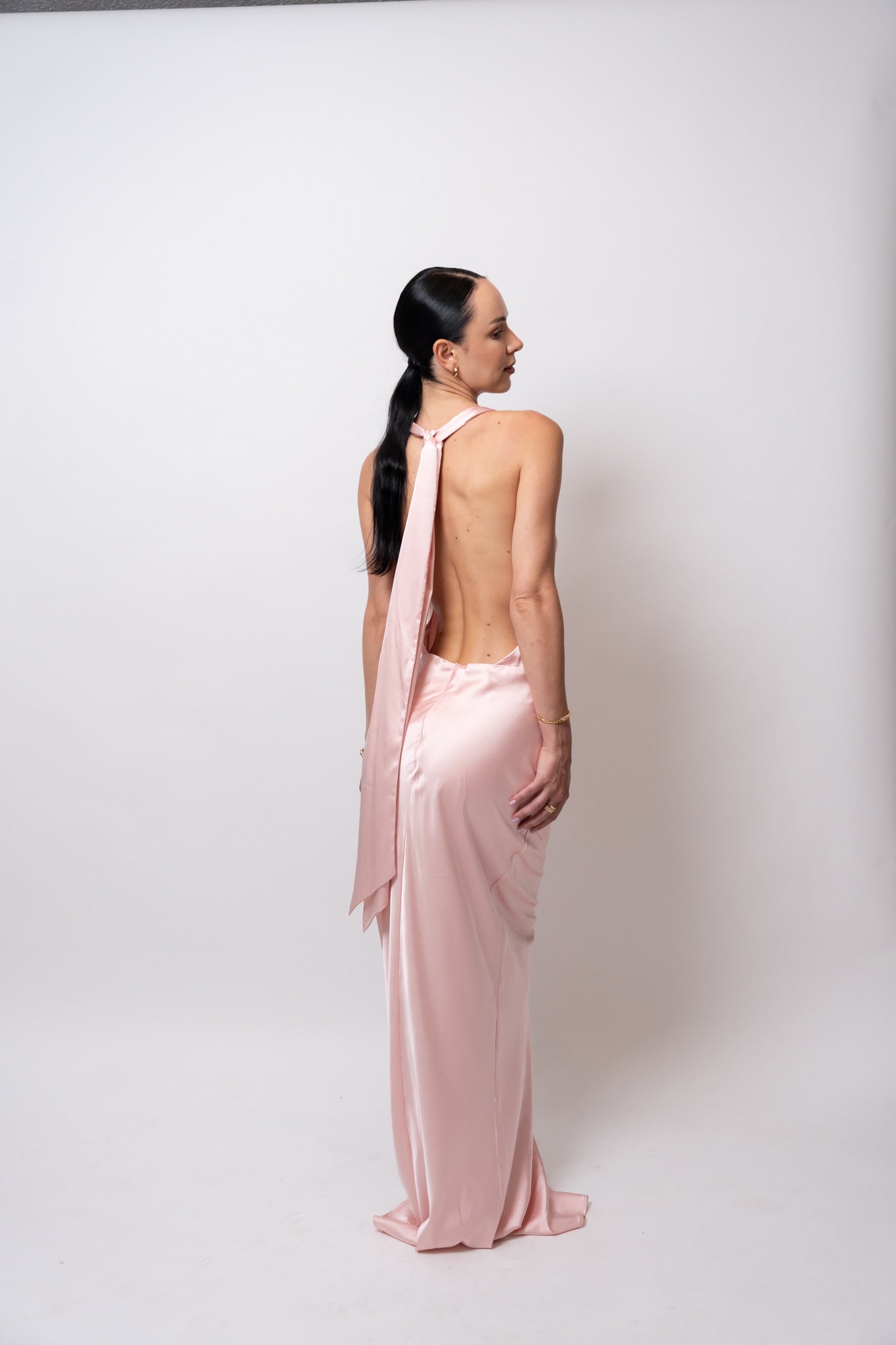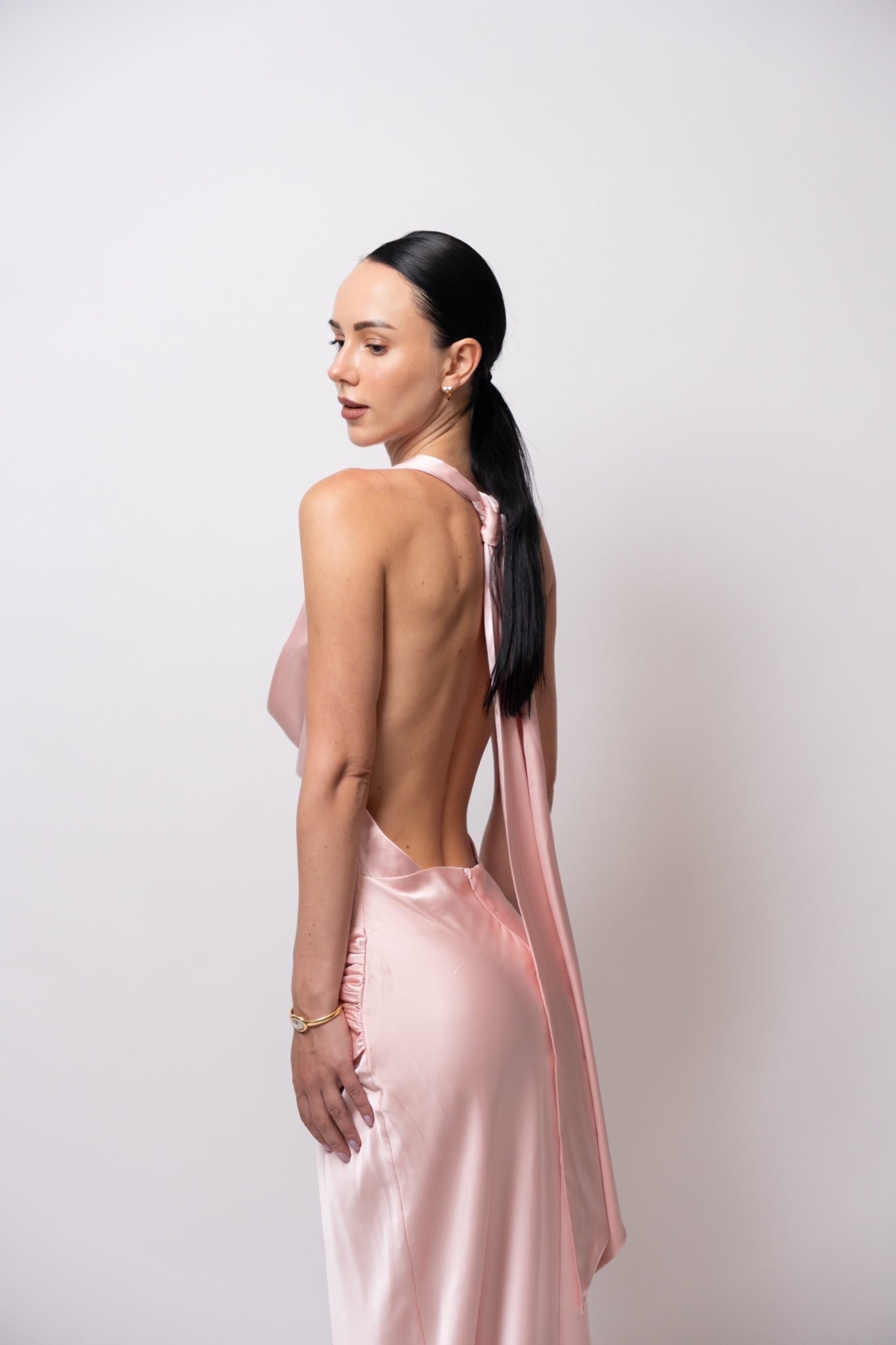 Su escote drapeado resalta el cuello y el pecho con delicadeza, mientras las espalda descubierta con caída fluida y lazo largo eleva el look con un toque inolvidable.