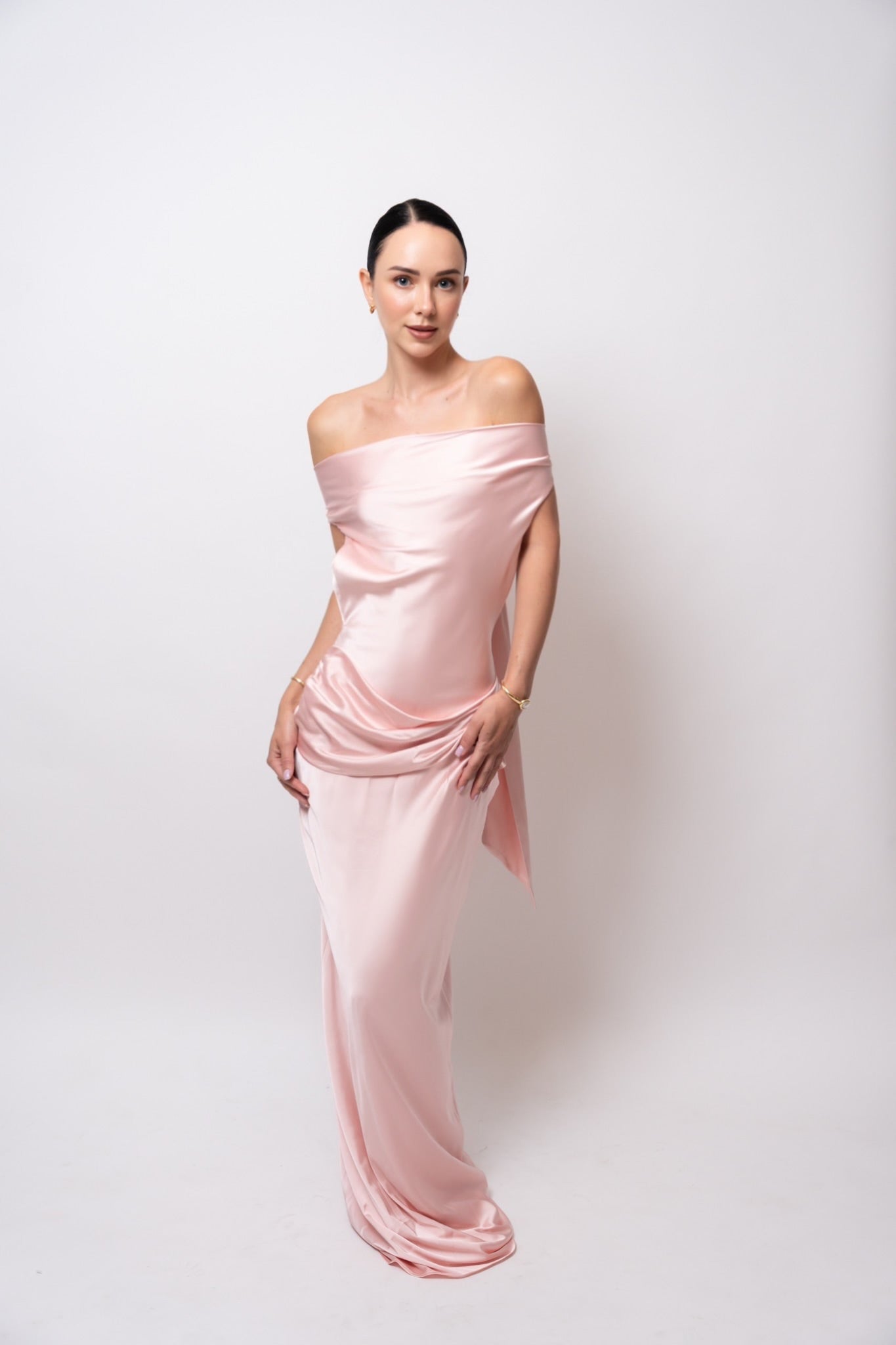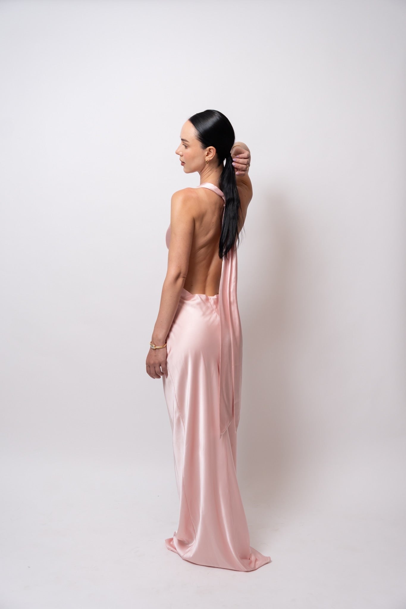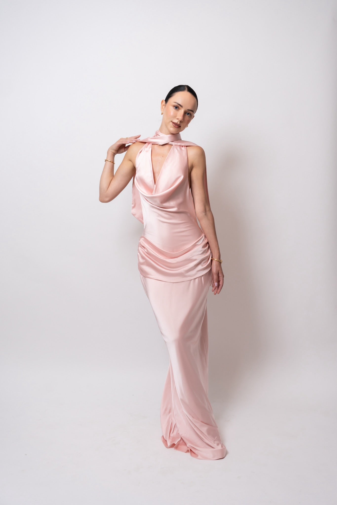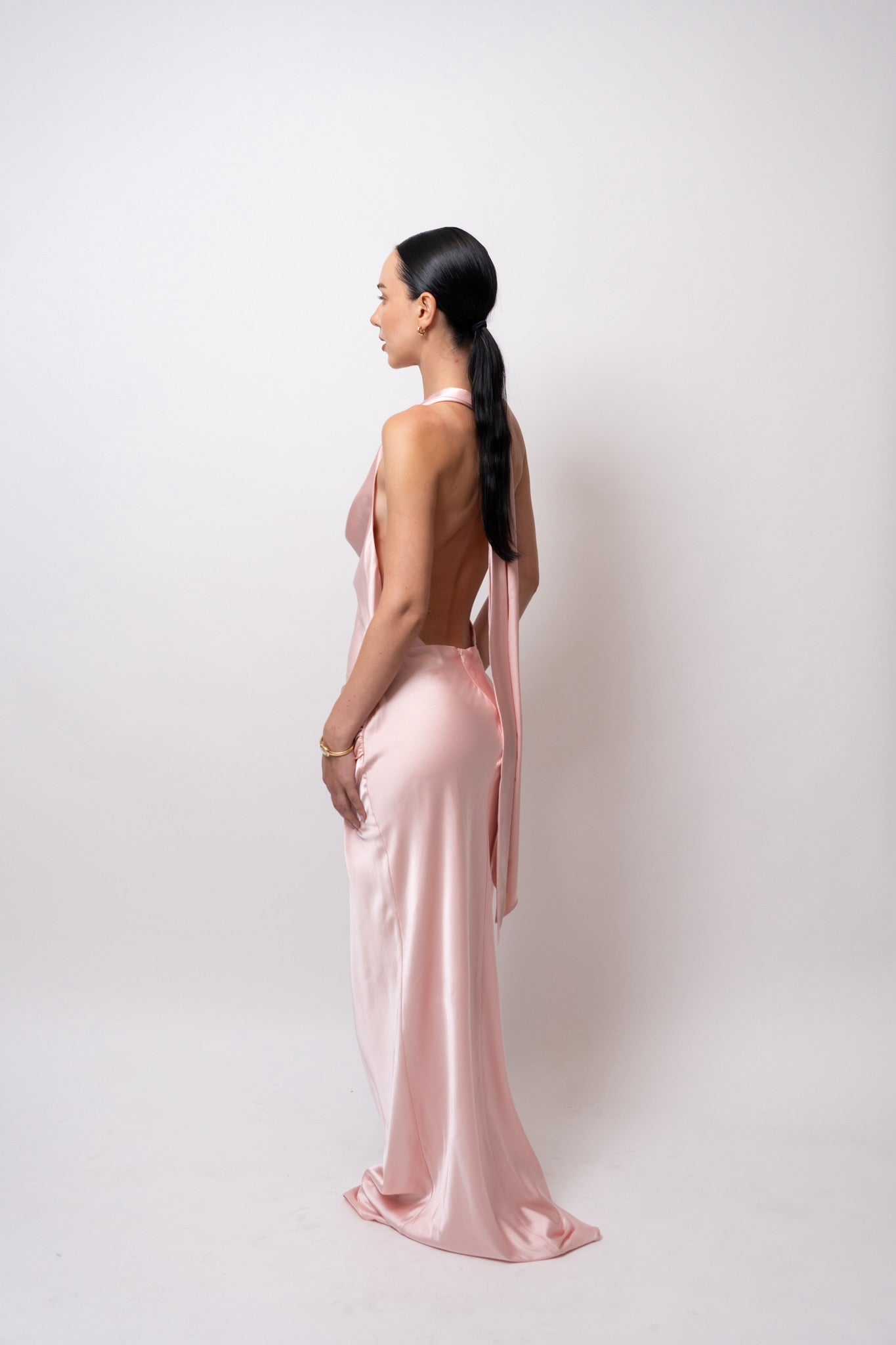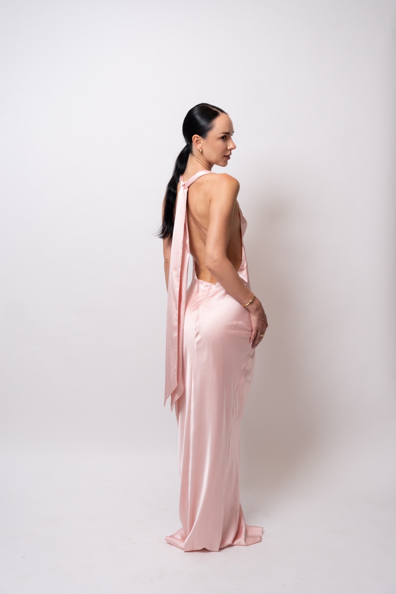 Su escote drapeado resalta el cuello y el pecho con delicadeza, mientras las espalda descubierta con caída fluida y lazo largo eleva el look con un toque inolvidable.