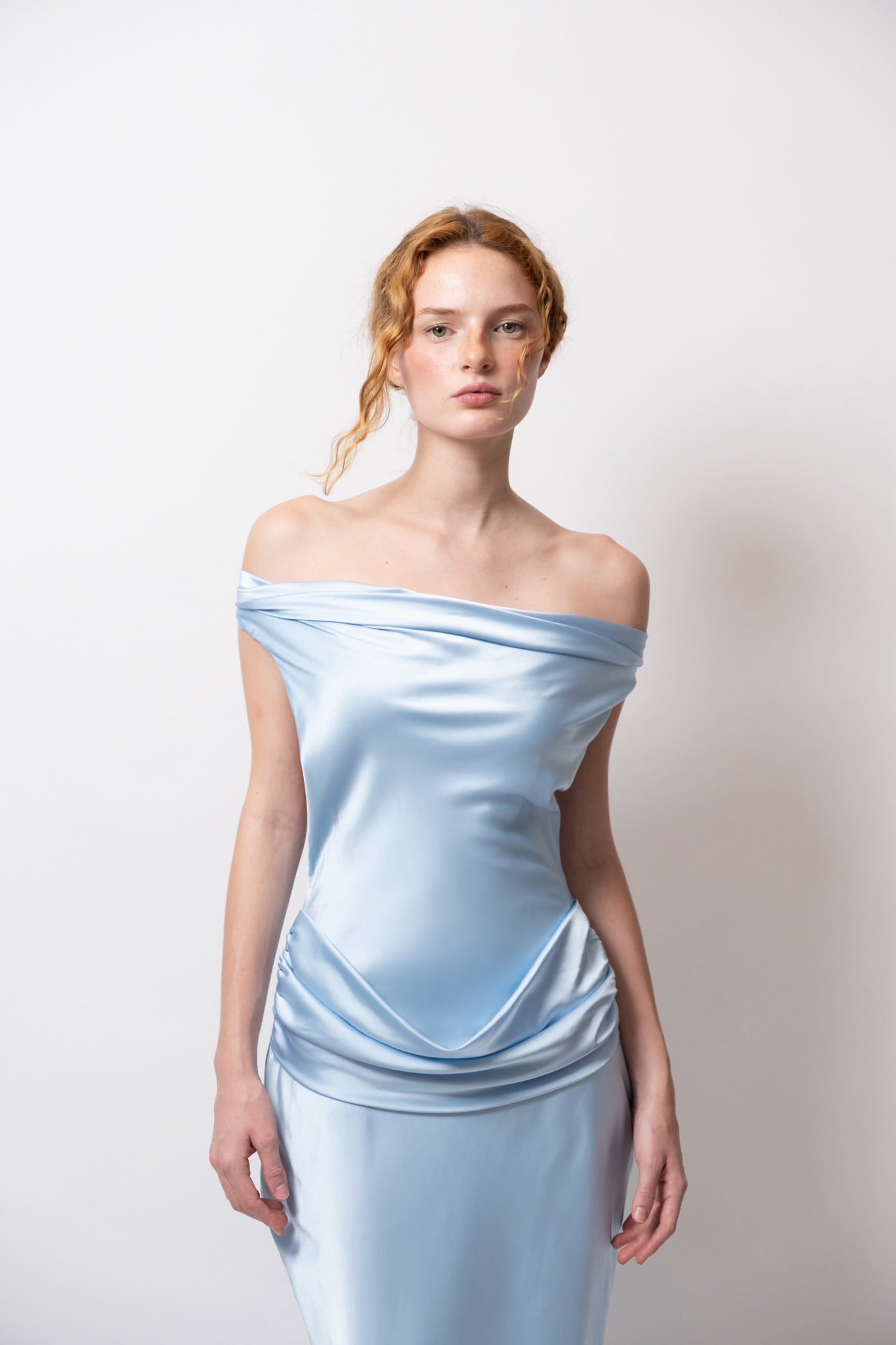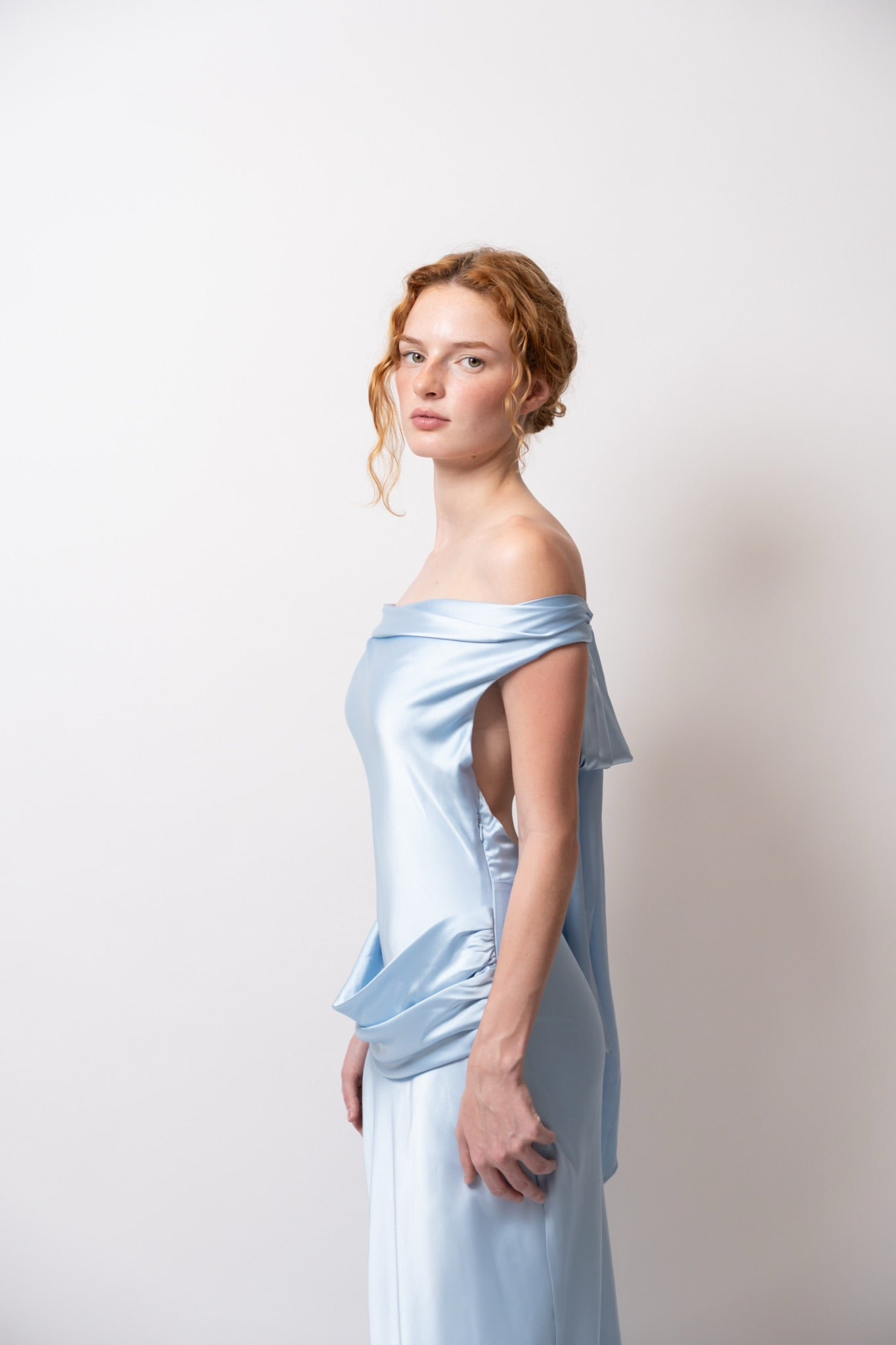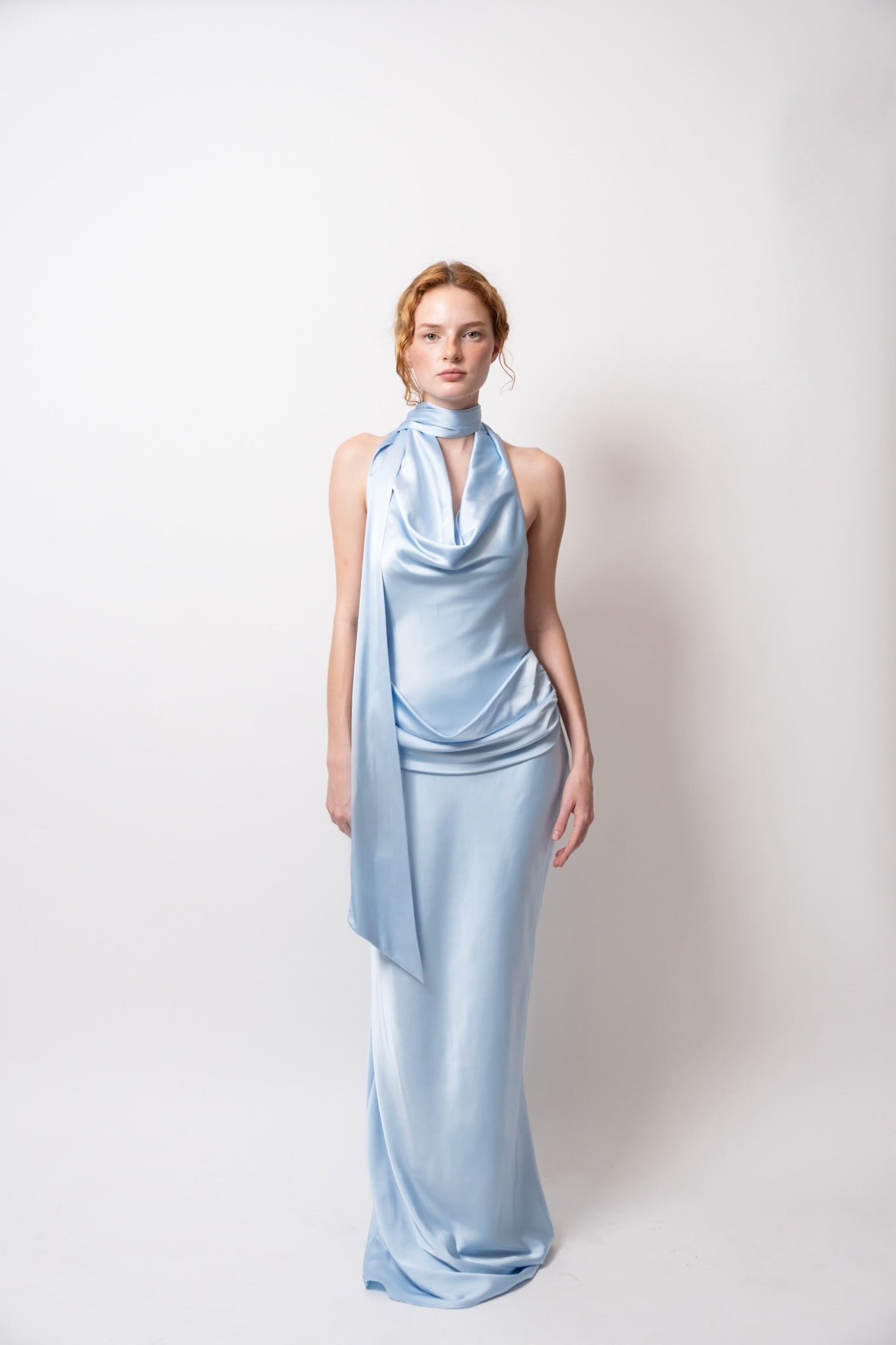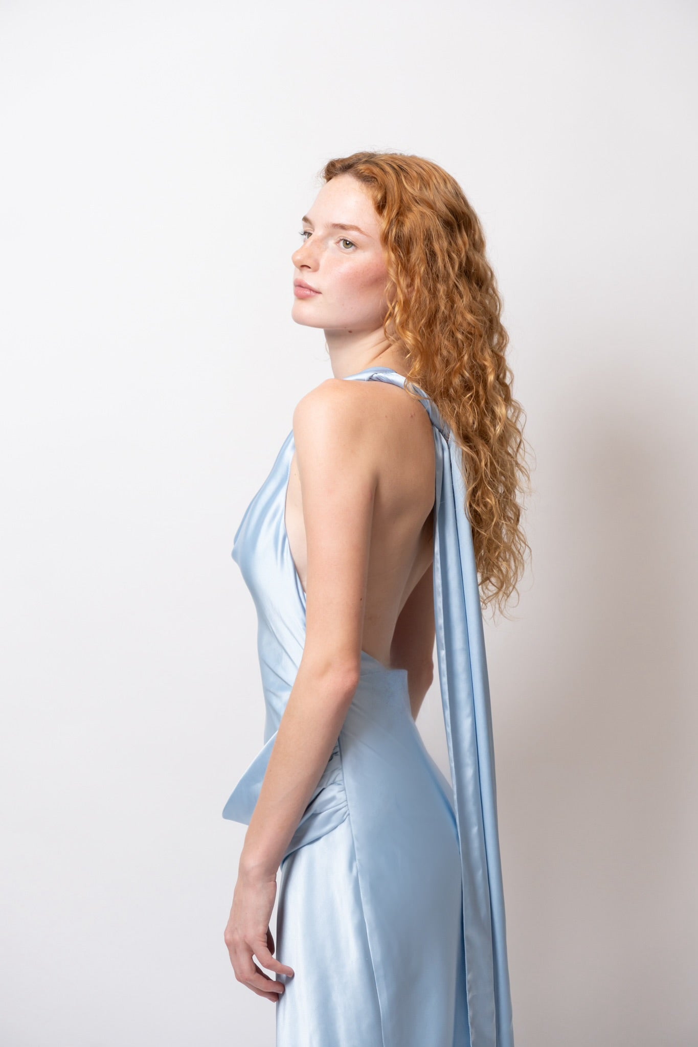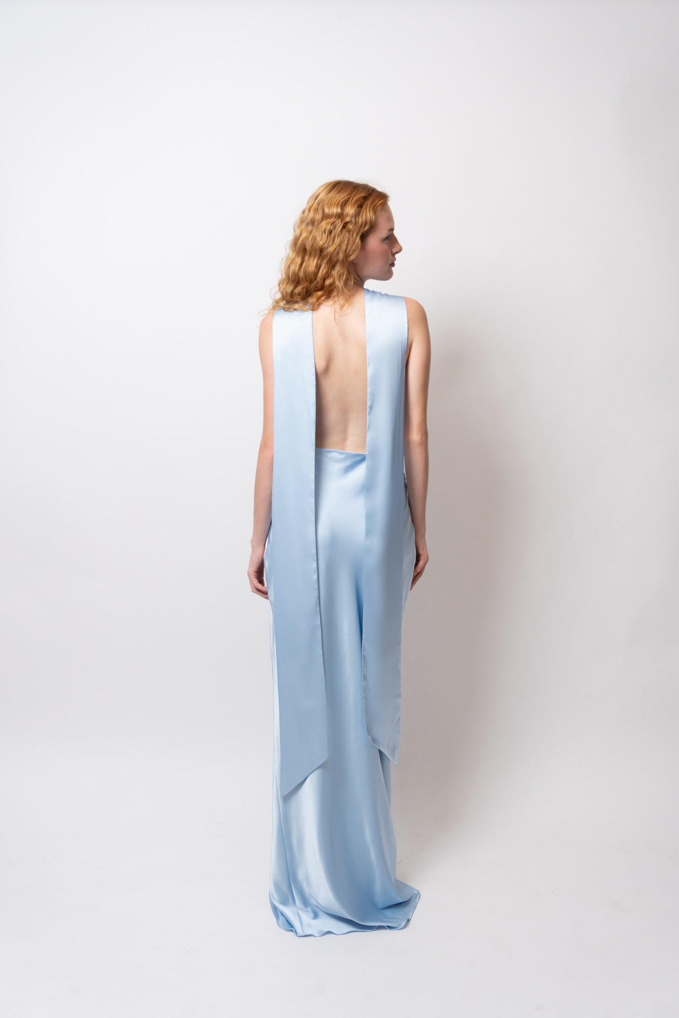 Su escote drapeado resalta el cuello y el pecho con delicadeza, mientras las espalda descubierta con caída fluida y lazo largo eleva el look con un toque inolvidable.