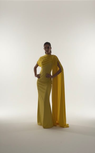 La capa larga y fluida cae desde el hombro con un movimiento elegante, añadiendo elegancia y sofisticación al vestido.