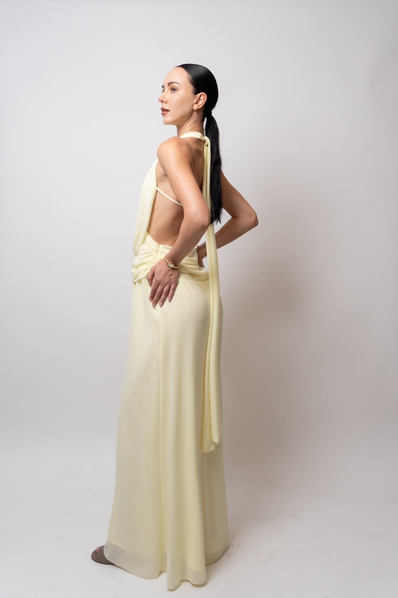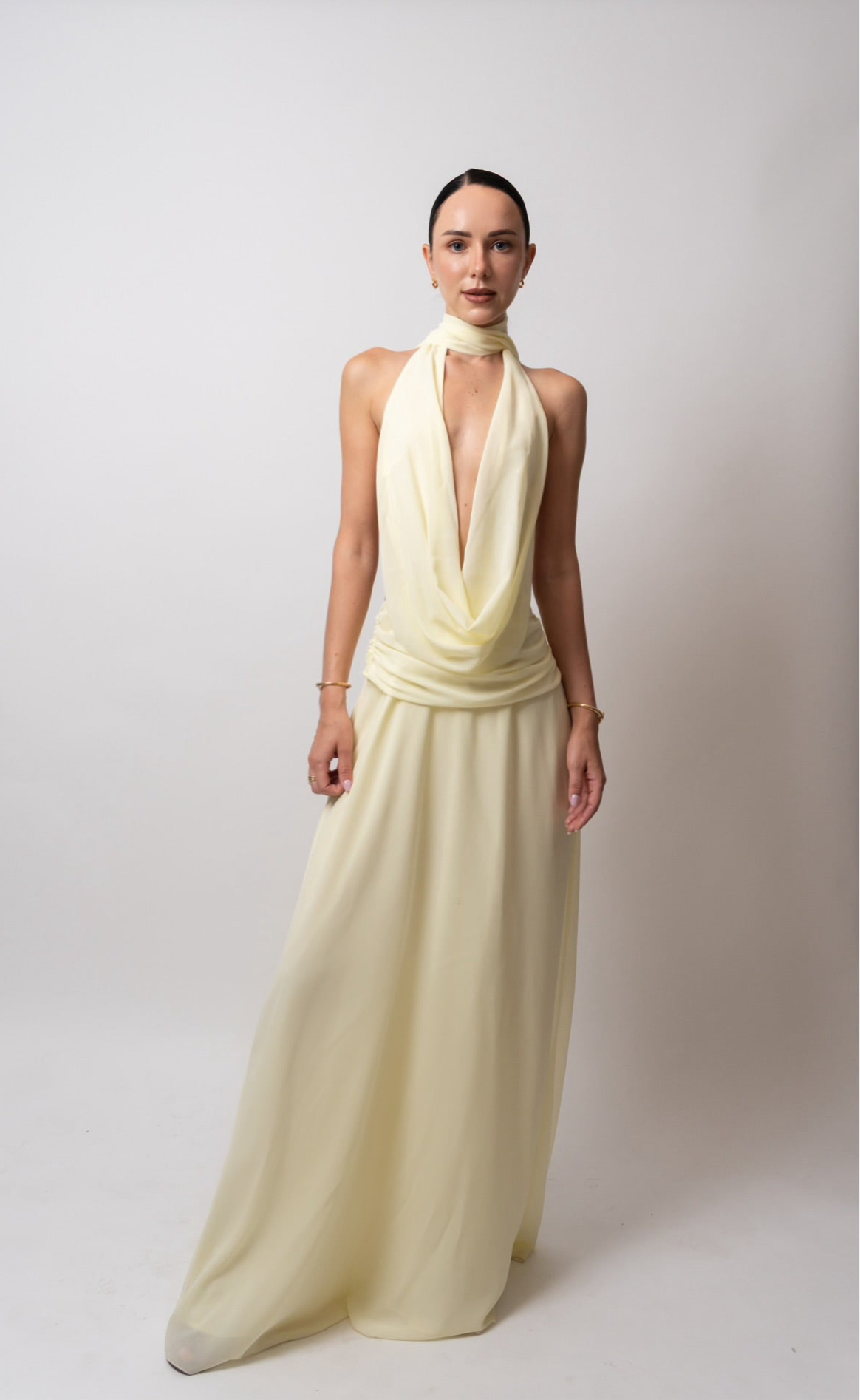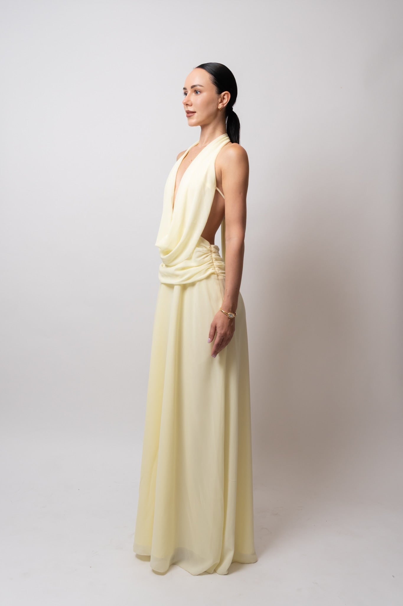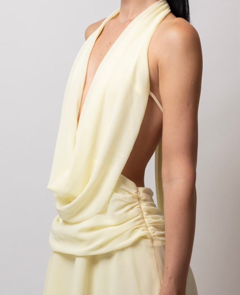 Confeccionado en tejido fresco de caída fluida, este vestido destaca por su escote drapeado en cascada, frunces laterales que estilizan la cintura y sutiles aberturas bajo los brazos que revelan el torso con delicadeza.