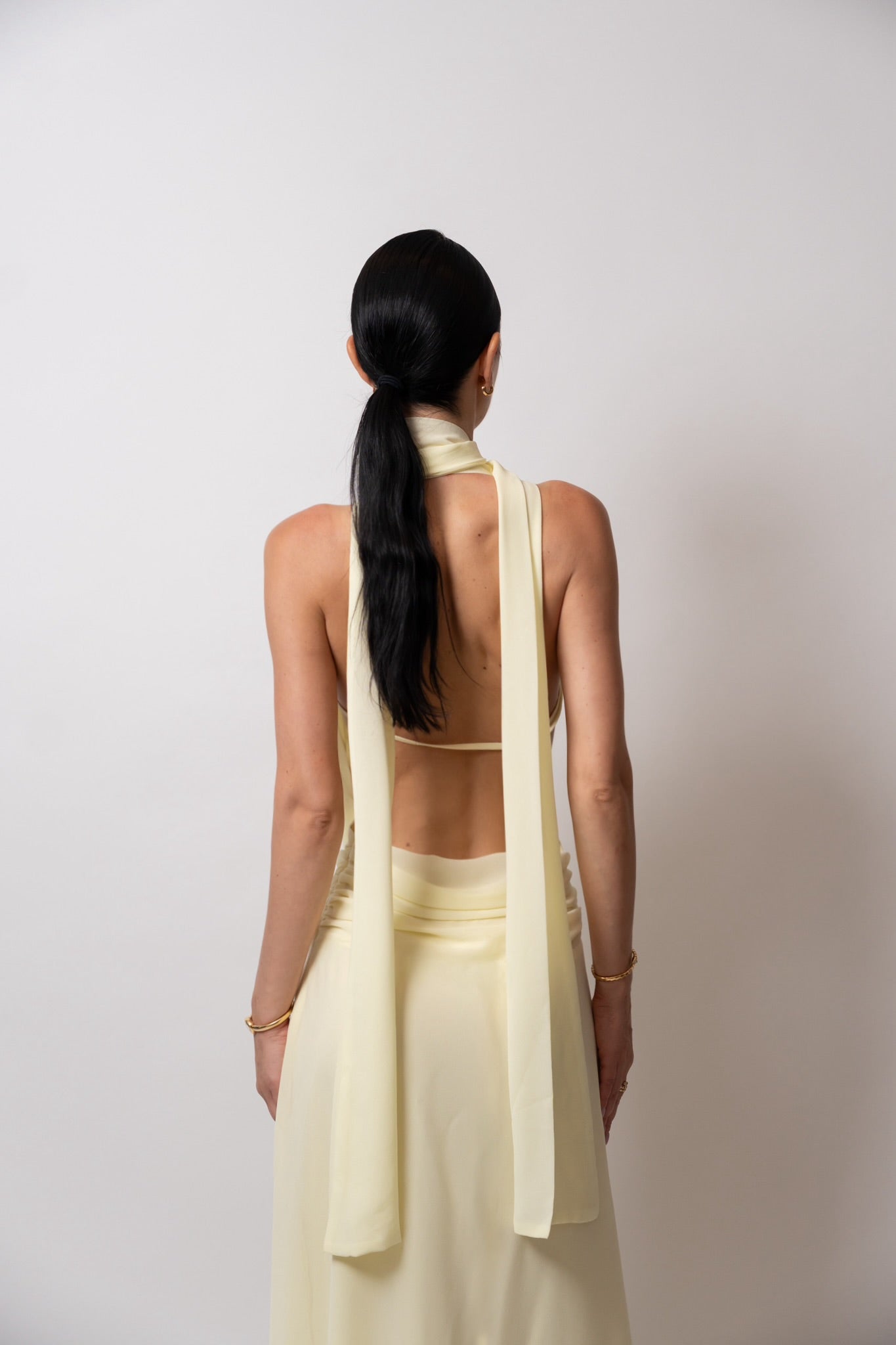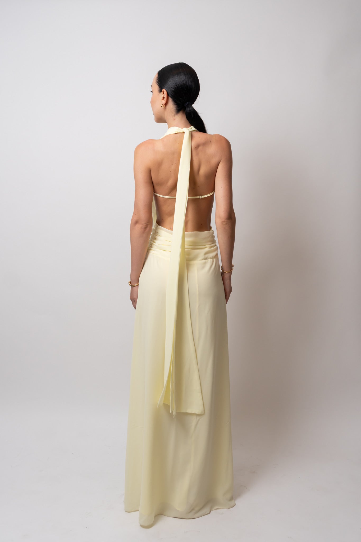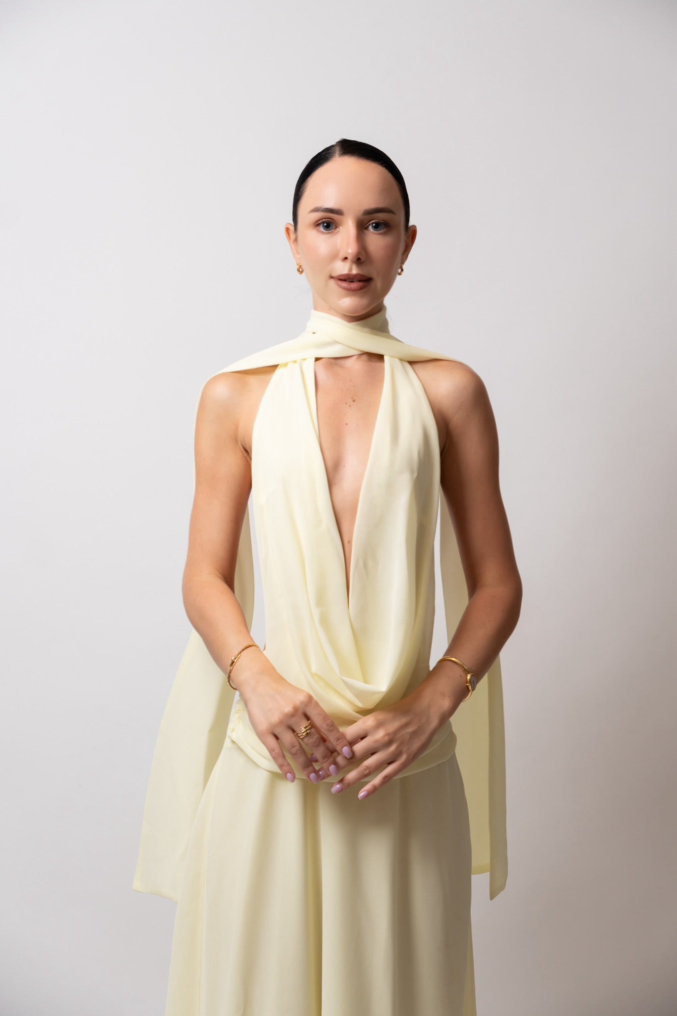 Confeccionado en tejido fresco de caída fluida, este vestido destaca por su escote drapeado en cascada, frunces laterales que estilizan la cintura y sutiles aberturas bajo los brazos que revelan el torso con delicadeza.