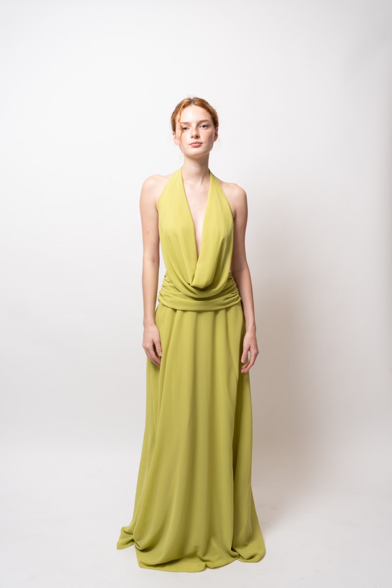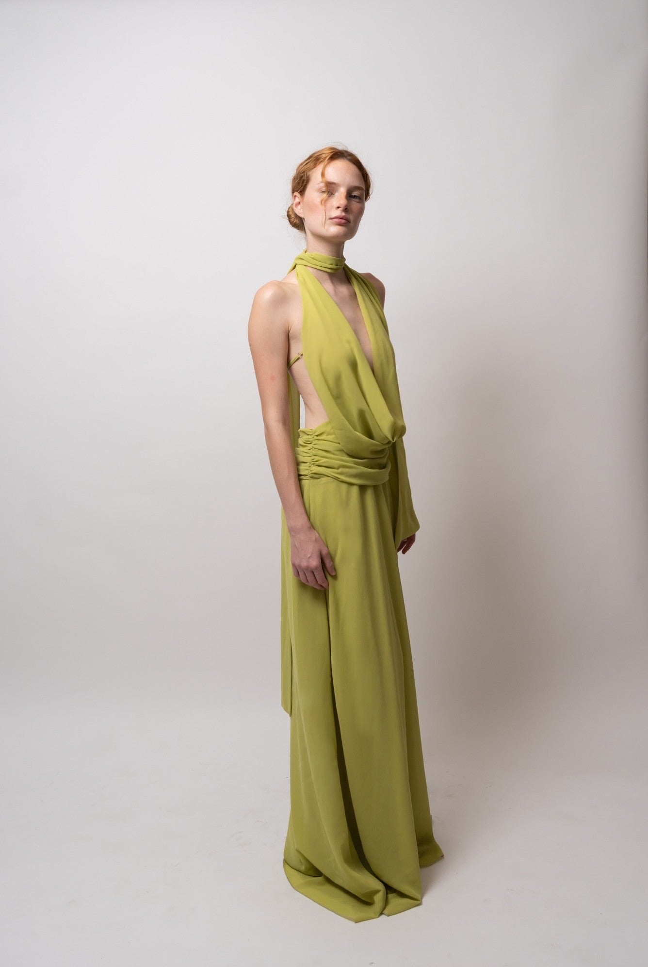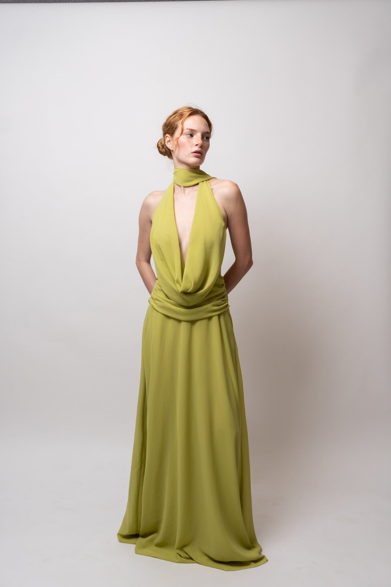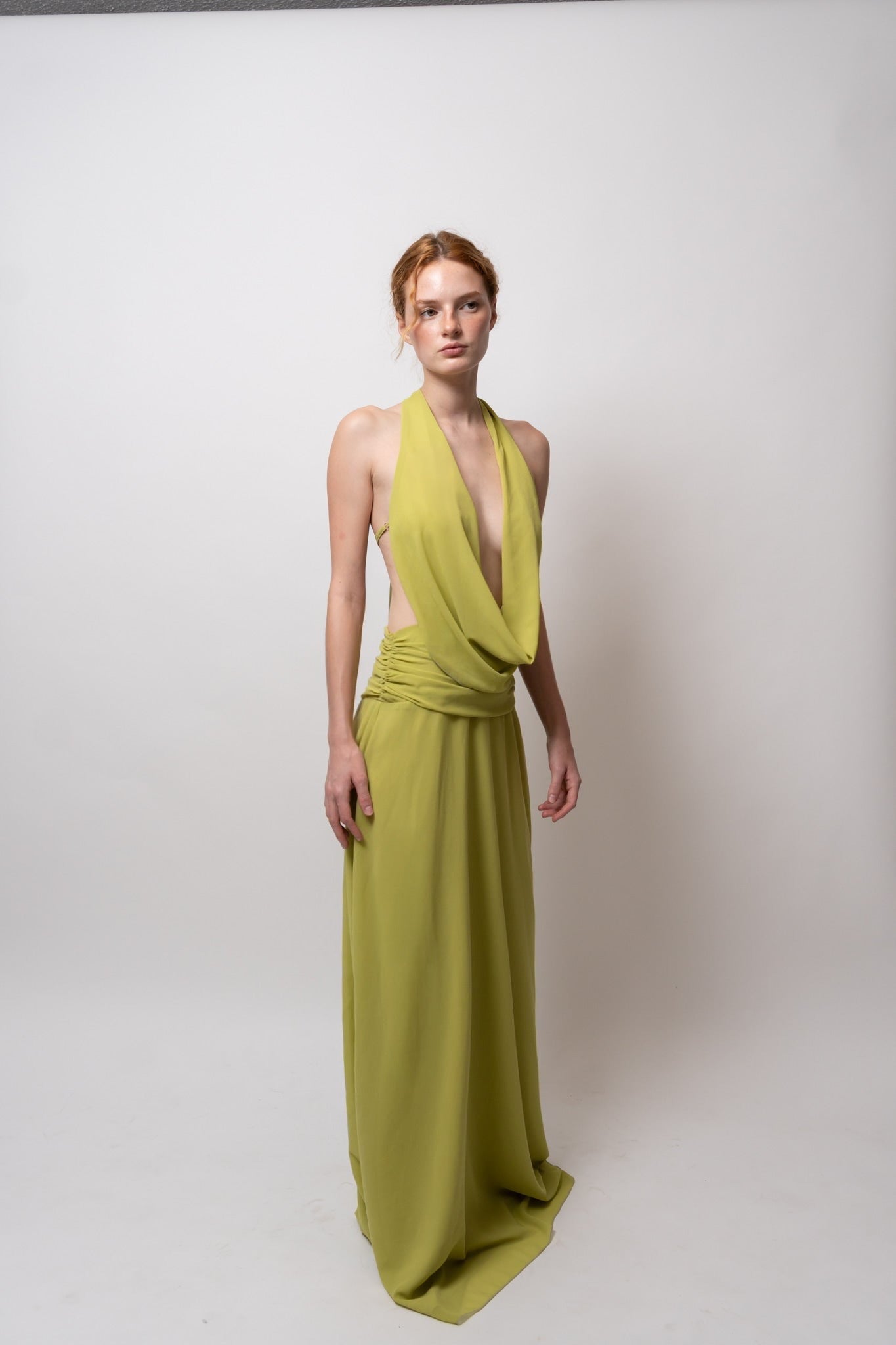 Confeccionado en tejido fresco de caída fluida, este vestido destaca por su escote drapeado en cascada, frunces laterales que estilizan la cintura y sutiles aberturas bajo los brazos que revelan el torso con delicadeza.