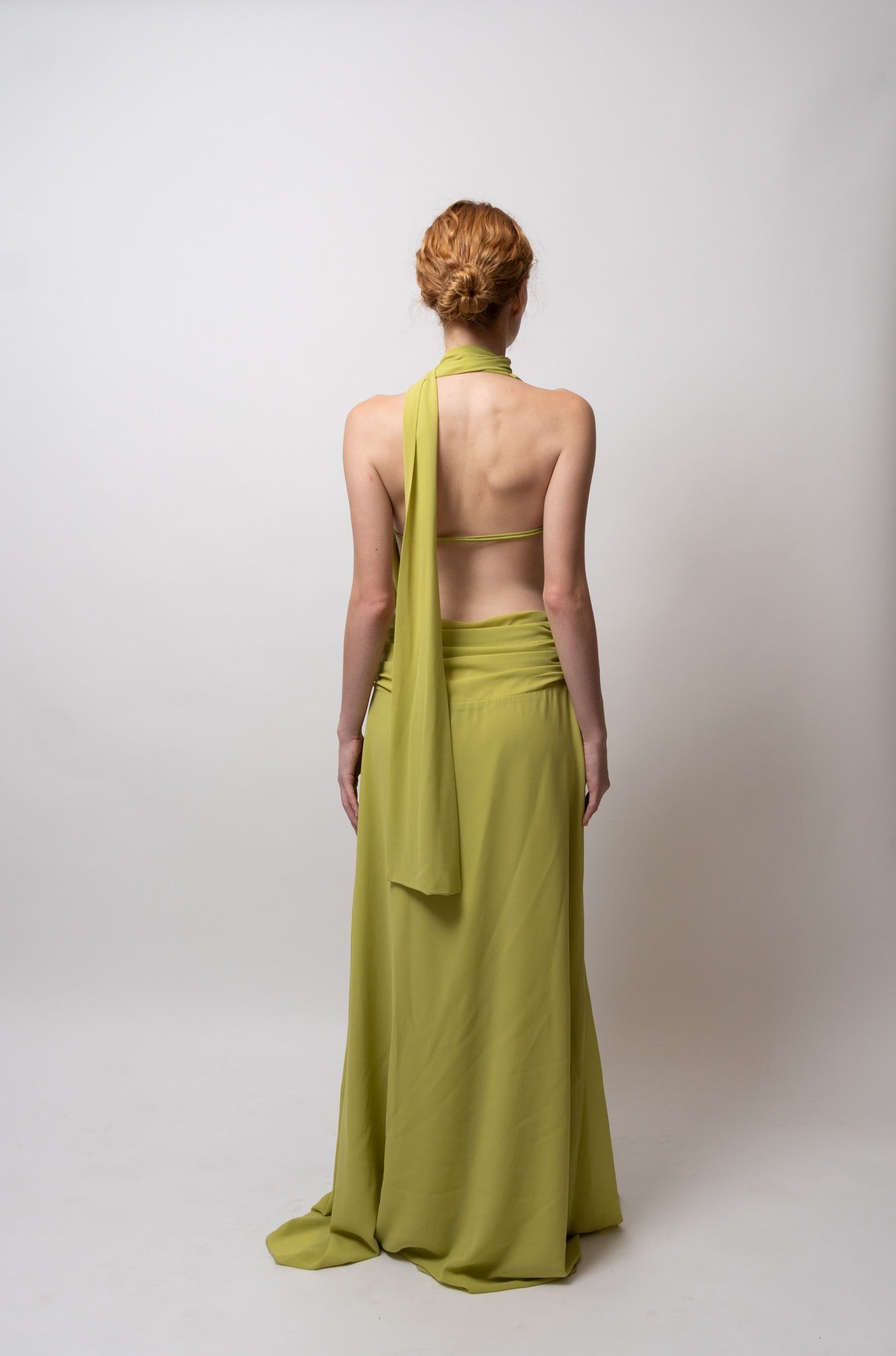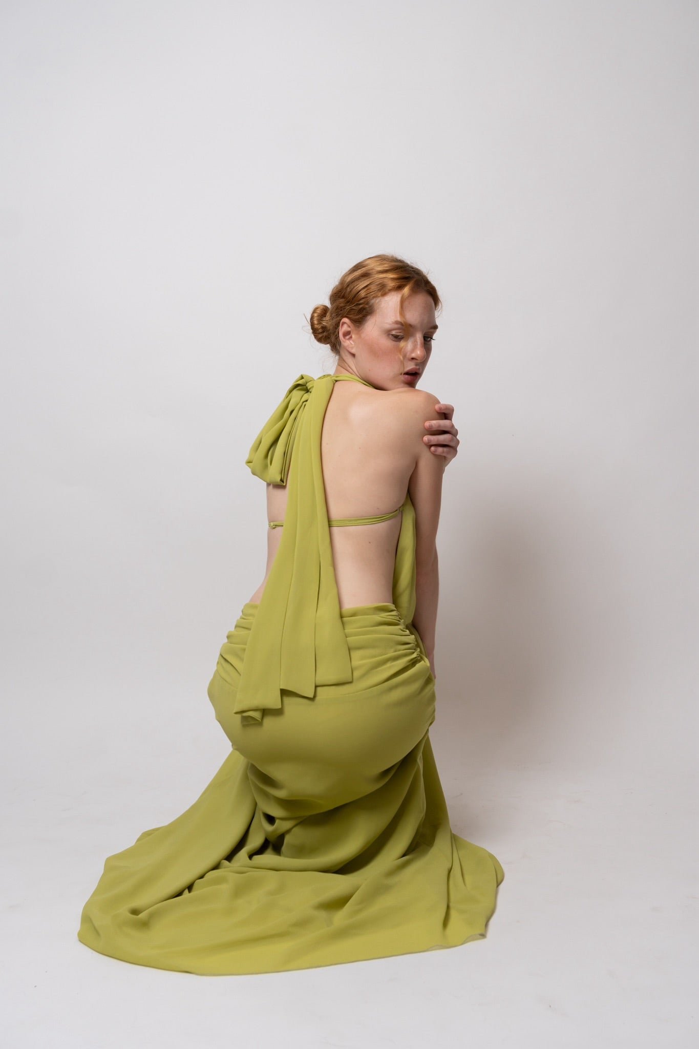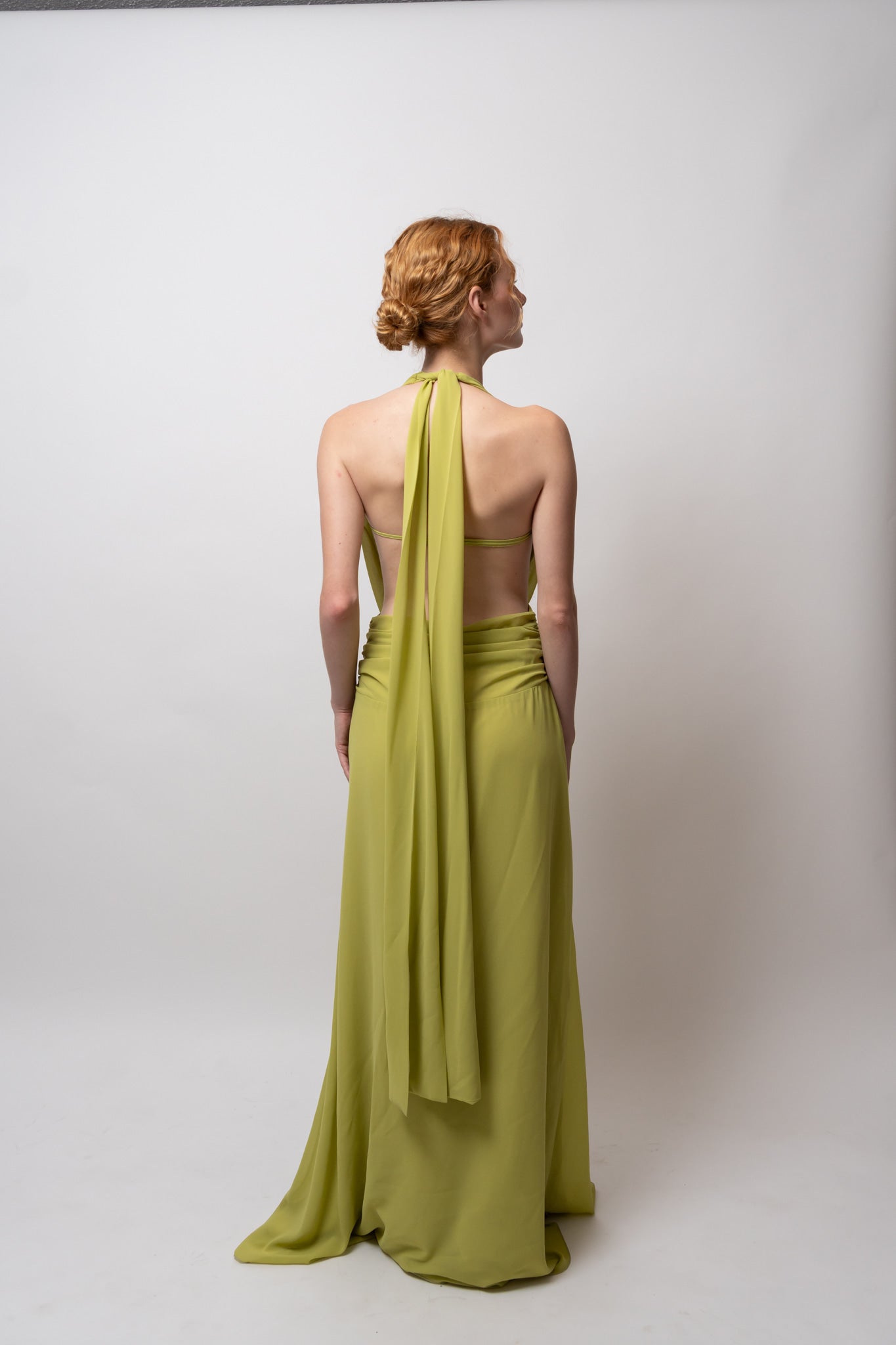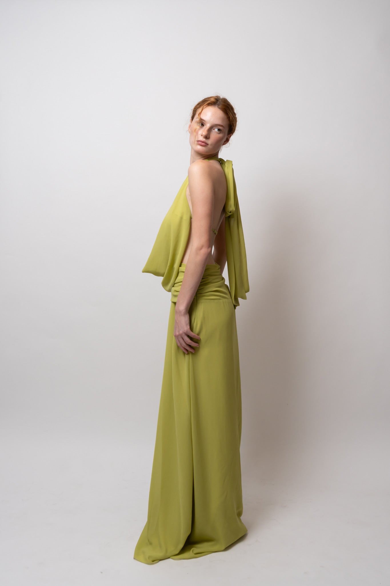 Confeccionado en tejido fresco de caída fluida, este vestido destaca por su escote drapeado en cascada, frunces laterales que estilizan la cintura y sutiles aberturas bajo los brazos que revelan el torso con delicadeza.